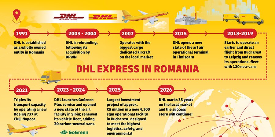 Anul acesta, DHL Express România marchează cu mândrie împlinirea a 35 de ani de activitate pe piața locală, consolidându-și poziția de lider în livrările internaționale express și reconfirmând angajamentul față de excelență și inovație.